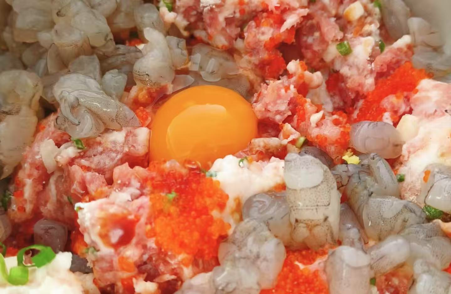 配料:猪肉、、飞鱼卵、葱、姜、胡椒粉、鸡精、味精、鸡蛋
